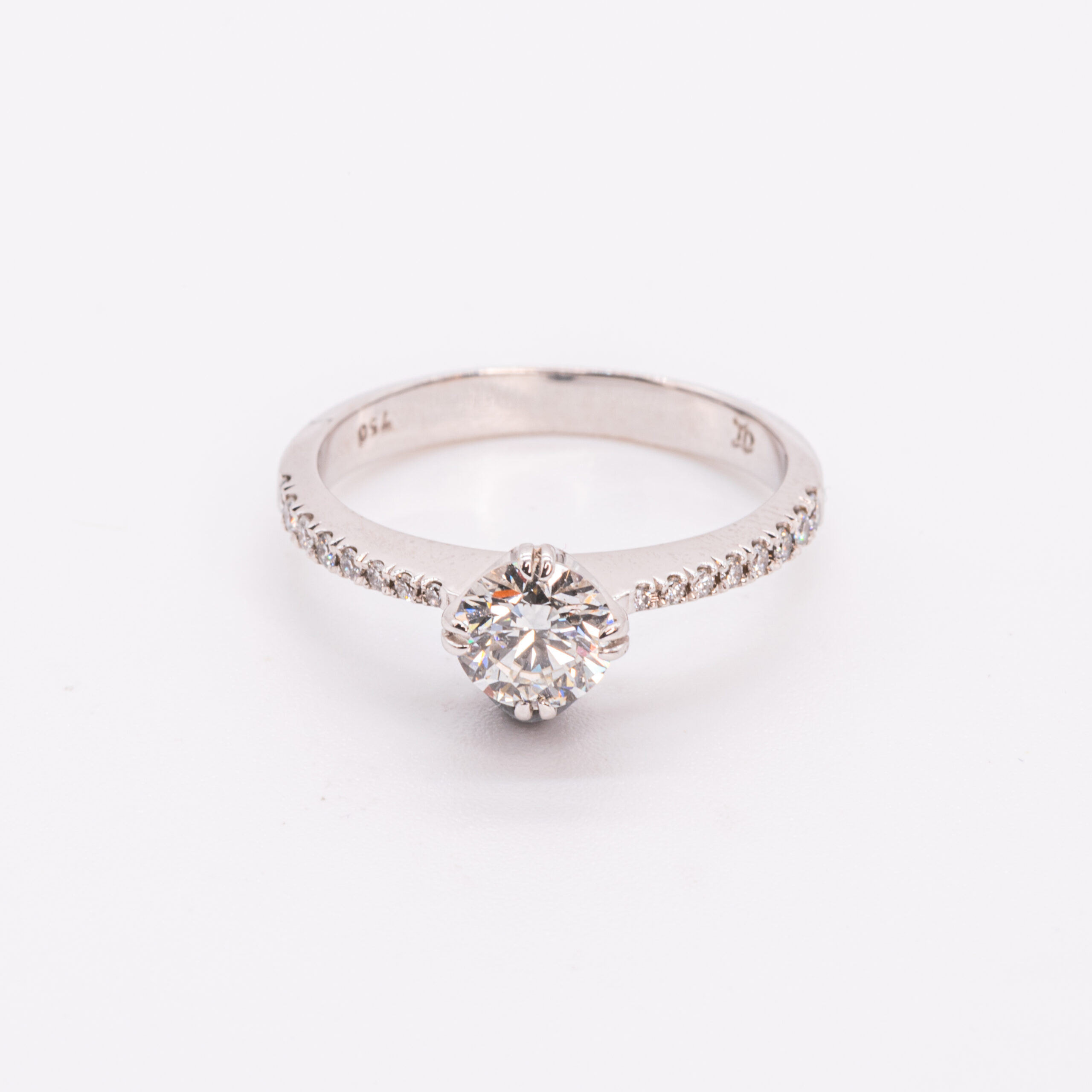 Atelier Heldwein “1902” brilliant-solitaire ring in white gold 18 carat/- white gold 2.80g 1 diamond H SI1 brilliant-cut diamond 0.74ct. 16 Diamond F VVS Brilliant 0.13ct. Ring size 54