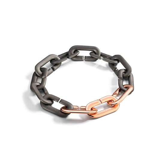 The bracelet consists of 12 links and can be composed according to personal preference, choosing between different materials and techniques: for example, the classic rose gold, white gold, plain titanium, titanium links with full diamond pavé or Vhernier’s Stellato pavé.