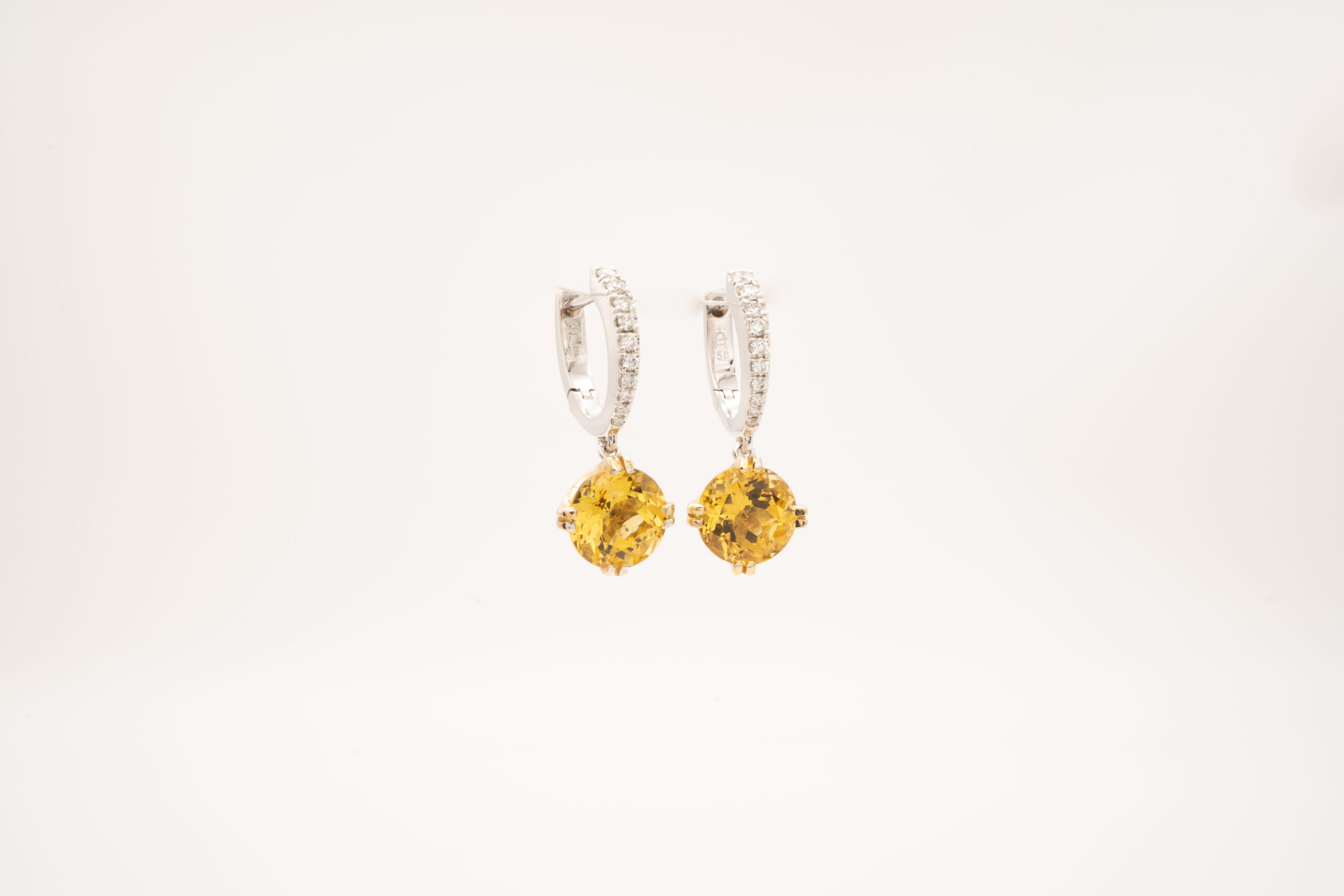 Atelier Heldwein „1902“ Ohrgehänge mit Heliodor in Weißgold 4,20g 750/000 Weißgold/Gelbgold Diamant Brillant 0,21ct. 2 Beryll gelb 5,40ct.