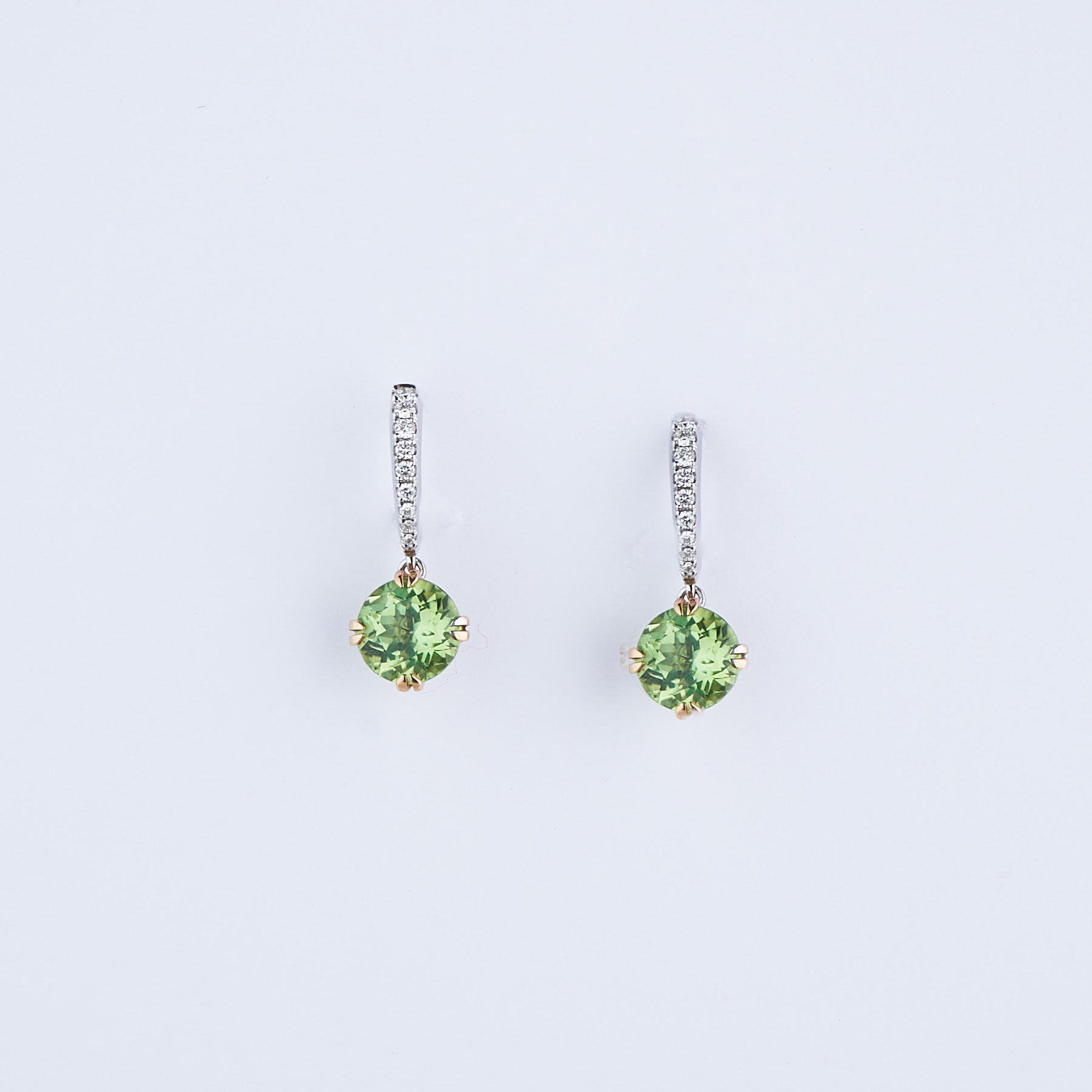 Atelier Heldwein „1902“ Ohrgehänge mit Peridot und Diamanten 4,25g 750/000 Weißgold/Roségold 2x Peridot hellgrün 4.25ct. 20x Diamanten F/VVS Brillant 0.18ct.