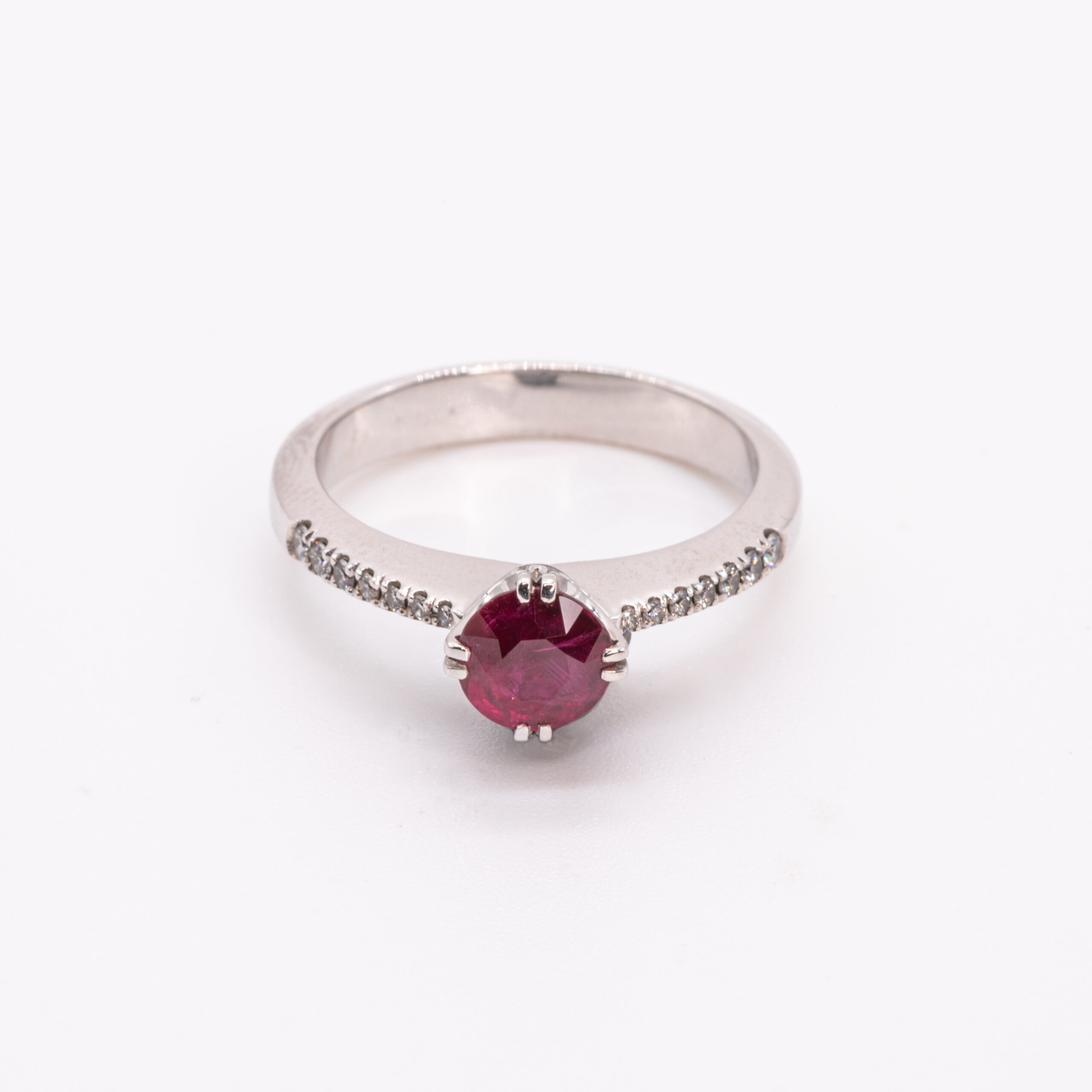 Atelier Heldwein „1902“ Ring mit Rubin und Diamanten 1 Rubin facettiert 1.01ct. 14 Diamant F/G VVS 0.10ct. 5,20gr 18 Karat/- Weißgold Ringgröße 53
