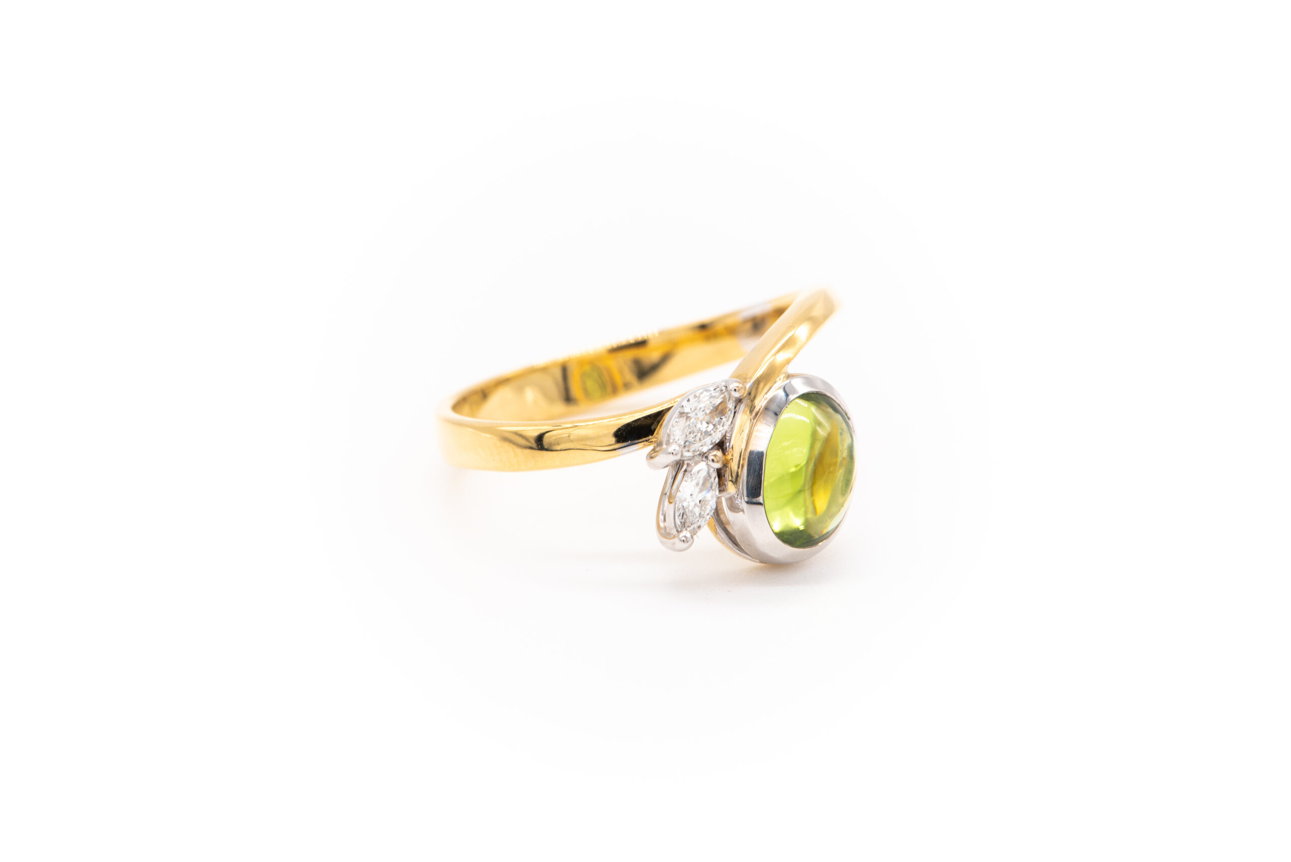 Atelier Heldwein „La Fleur“ Ring mit Peridot 3,8g 750/000 Gelbgold/Weißgold Peridot Cabochon 1,32ct. Diamant G/F VVS Marquise 0,16ct. Ringgröße 55