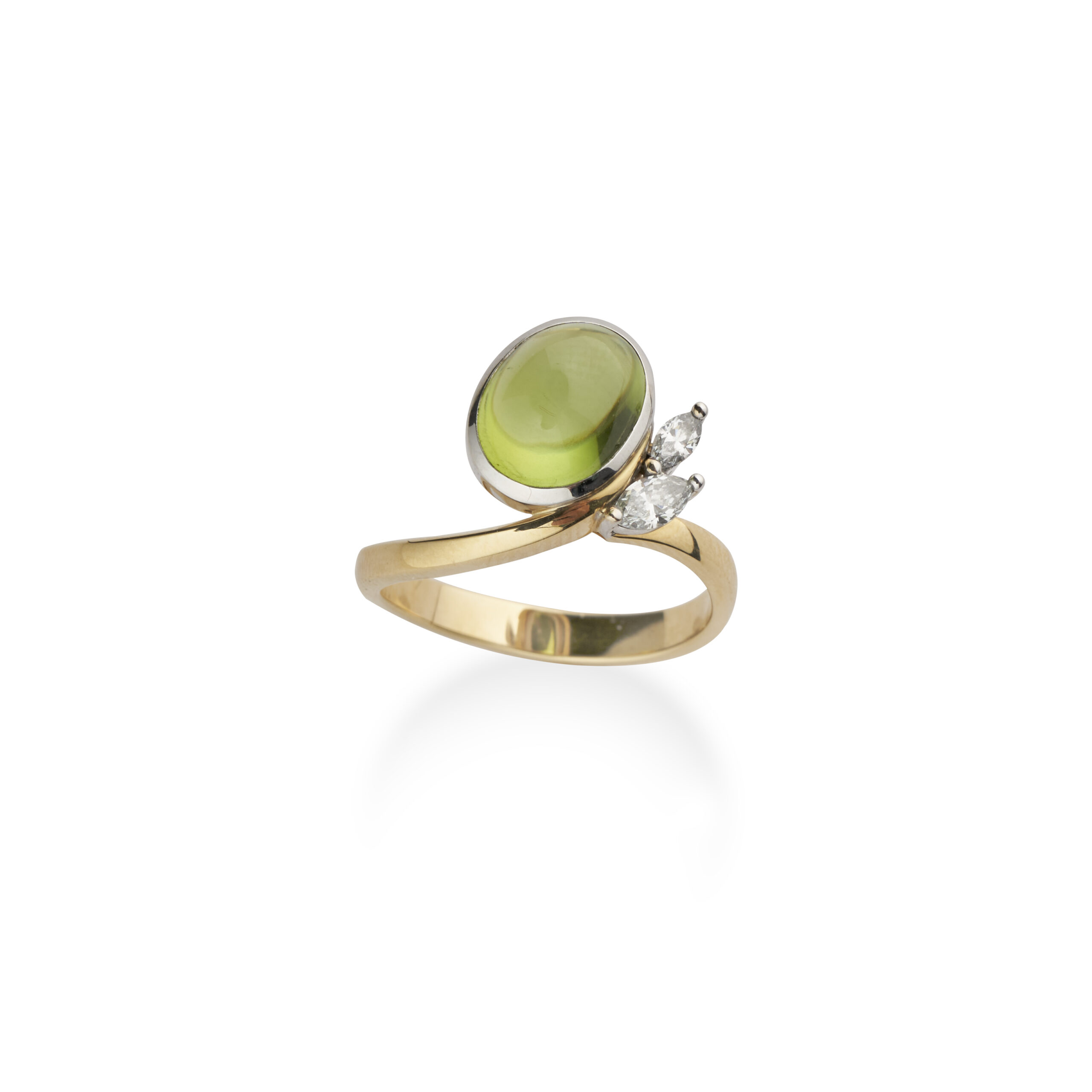 Atelier Heldwein „La Fleur“ Ring mit Peridot 4,85g 750/000 Weißgold/Gelbgold Diamant G/F VVS Marquise 0,07ct. Diamant G/F VVS Brillant 0,11ct. Peridot Cabochon 3,39ct. Ringgröße 55